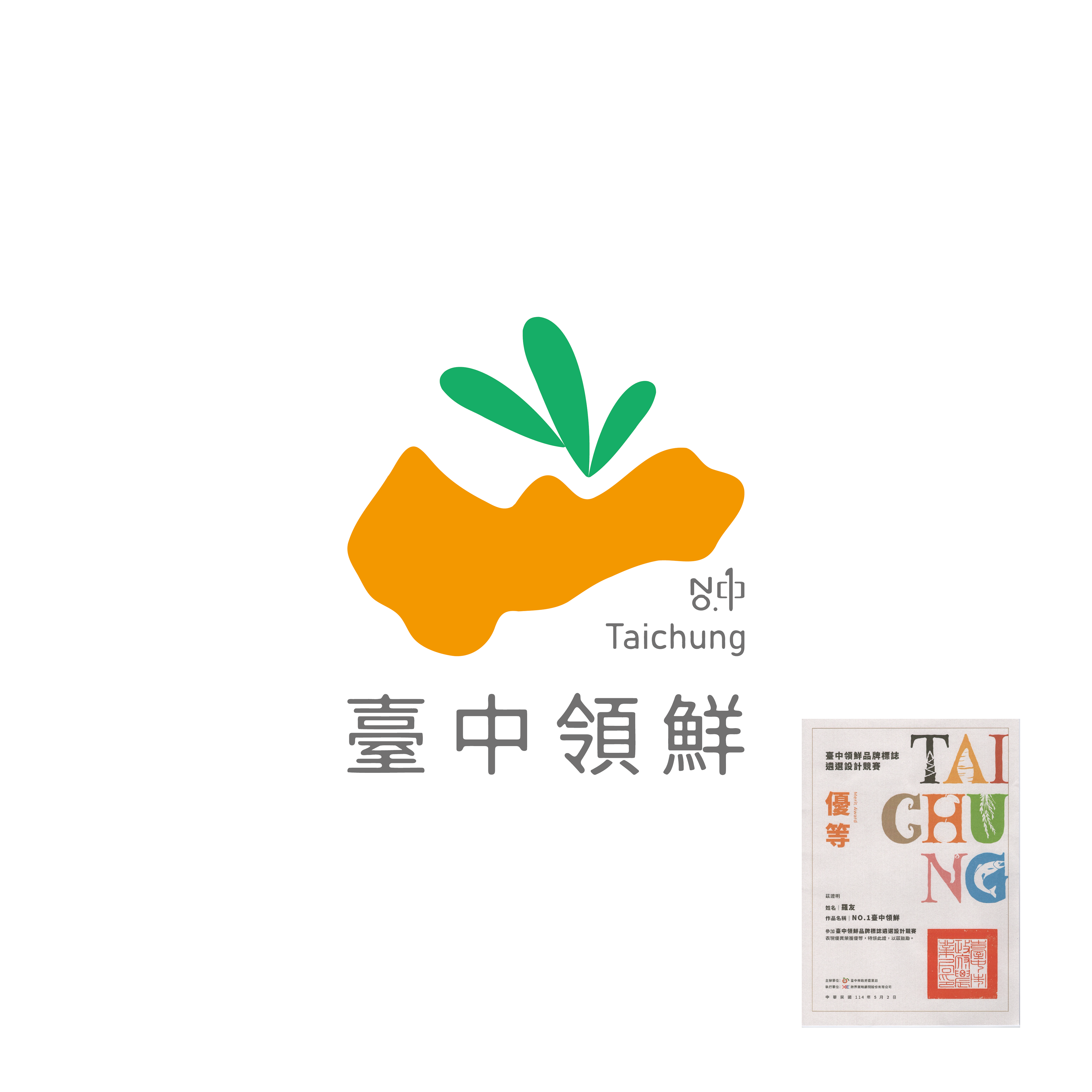 此LOGO設計以台中地圖為主要發想,並將LOGO結合出「茂谷柑」的頂部,將梗與葉片作為發揚的意象,代表台中NO.1的農產品發揚國際,領鮮全世界。標準字的英文部分,特別將「台中」字樣以英文 「NO.1」去排列出,代表台中農產領鮮國際。